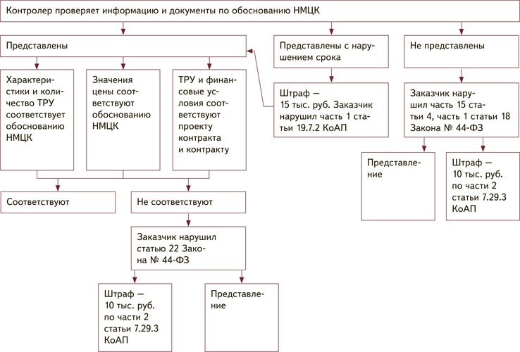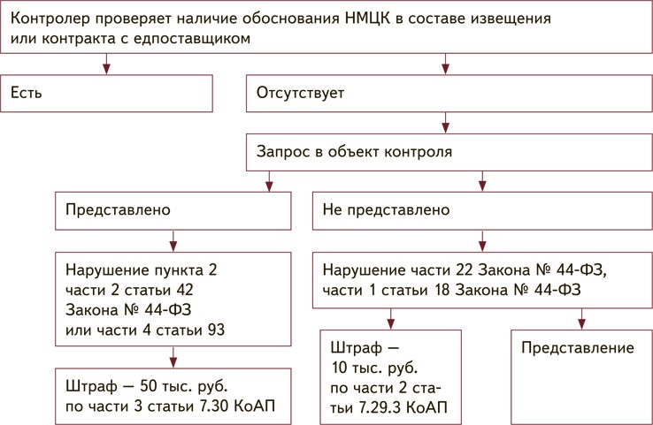 Шаг 1. Проверка наличия обоснования НМЦК в извещении или контракте. Еще перед началом проверки контролеры изучают ЕИС, смотрят, включил ли заказчик обоснование НМЦК в извещение либо в контракт с единственным поставщиком. Отсутствие обоснования могут признать нарушением пункта 2 части 2 статьи 42 и части 4 статьи 93 Закона № 44-ФЗ. Штраф — 50 тыс. руб. по части 3 статьи 7.30 КоАП. Смотрите на схеме 1 порядок проверки на этом этапе.