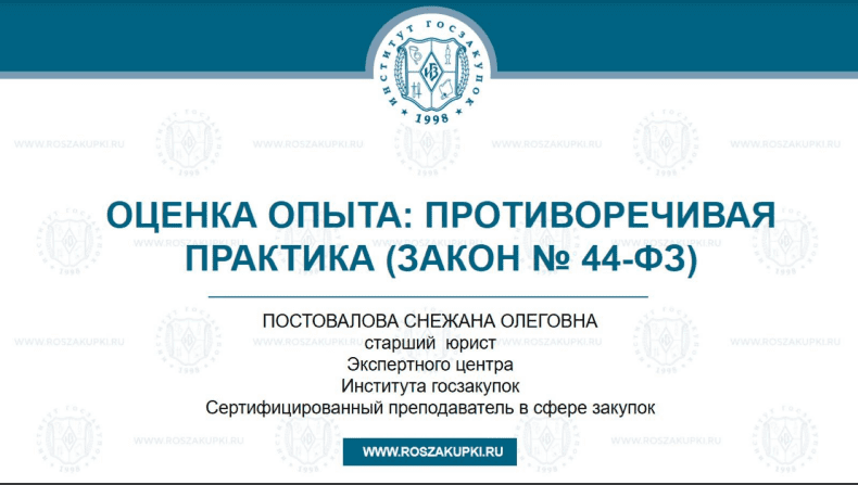 В новом выпуске видеорубрики «Просто о сложном» старший юрист Экспертного центра Института госзакупок Снежана Постовалова рассматривает противоречия в правоприменительной практике в отношении установления заказчиками по Закону № 44-ФЗ показателя «наличие у участников закупки опыта поставки товара, выполнения работы, оказания услуги, связанного с предметом контракта», критерия оценки заявок «квалификация участников закупки» (Положение об оценке заявок, утвержденное постановлением Правительства РФ № 2604 от 31.12.2021).