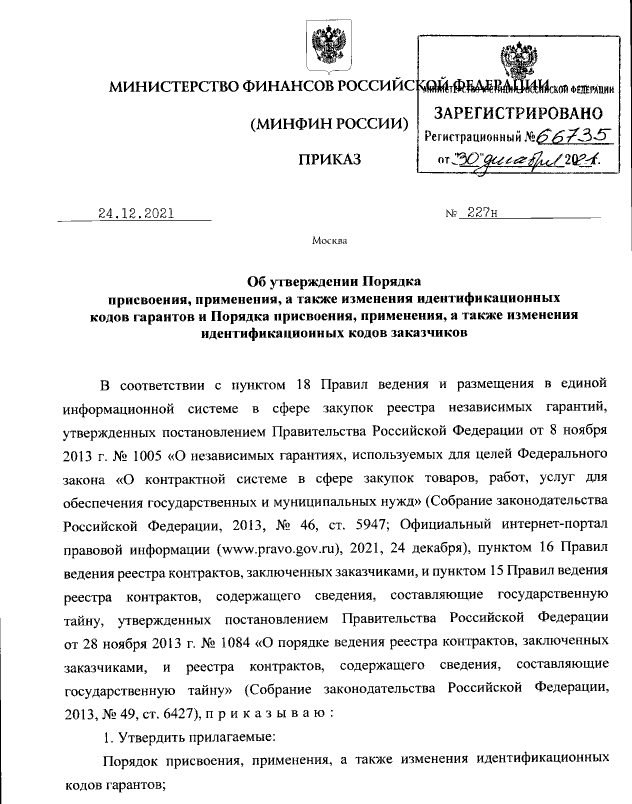 Документ: Приказ Минфина России от 24 декабря 2021 г. N 227н